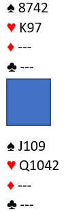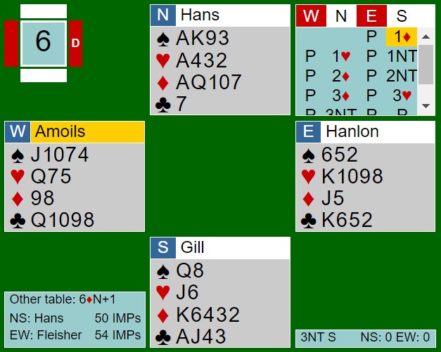 (Jeg tar fordbehold om at det kan hende det var tieren som ble spilt og at det var vu-graph operatøren på BBO som klikket hjerter 9 i stedet for hjerter 10)
