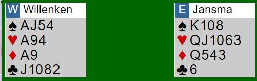 Her et artig spill hvor man kan stusse på hvordan det gikk til at utgangen 4 hjerter ble vunnet. Det ble to bet i samme kontrakt ved det andre bordet.