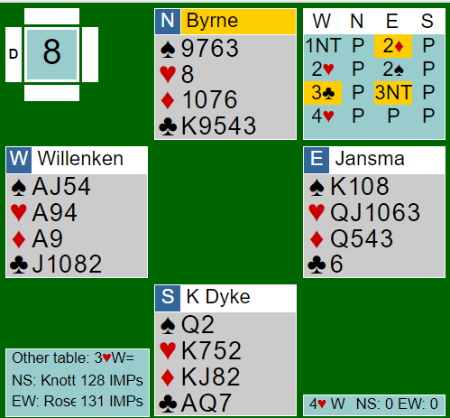 Spillet ga N/S 11 IMP for +420 sammen med lagkameratenes +100 fra det andre bordet, men de tapte likevel kampen med 2 IMP.