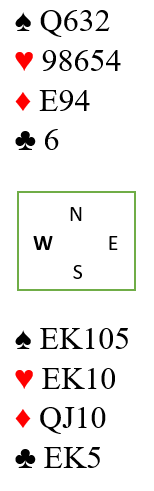Som sagt, ingen garantier, men det er meget sannsynlig at øst har fire spar, fem hjerter (det vet vi) - 3 ruter (som vi også vet) og en kløver, dvs. 4-5-3-1 fordeling, altså singelton kløver!