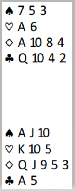 Det kan komme ruter ut som er ubehagelig hvis syd er spillefører. Og det er jo syd som har de overlegent sterkeste kortene med hele 24 HP. Om det kommer ruter ut og syd er spillefører må finessen gå i første stikk, for spillefører har ikke fått satt opp hjerteren til ruteravkast. Hvis den svake hånden (nord) er spillefører, vanligvis ikke det beste, er det en bedre sjanse i 6 spar, for da er ruteren beskyttet og spillefører får tid til å godspille hjerteren. I så fall vinnes tolv stikk i 6 spar om det ikke sitter alt for galt.