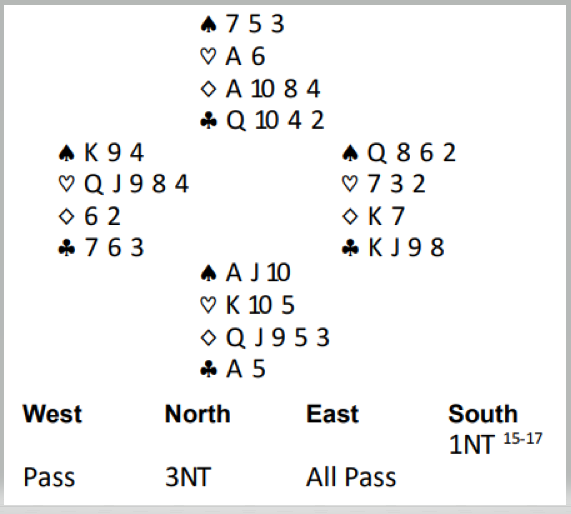 Ved det ene bordet i denne lagkampen tenkte ikke syd sånn og bare satte i gang. På den utspilte hjerterdamen ba han om esset, spilte kløver til esset og ruter dame som fikk seile. Men øst hadde ruter konge og spilte hjerter gjennom syds K-10. Spillefører la tieren, vest vant med damen og spilte hjerter 9 til kongen (øst fulgte farge). Nå var det kun åtte stikk, og vests hjerter var godspilt. Spillefører forsøkte liten kløver mot Q-10 og la tieren idet vest la liten. Hvis knekten hadde vært hos vest og kongen hos øst ville damen bli godstpilt og gitt det niende stikket. Men øst stakk med kløver knekt og spilte liten spar. Spillefører trodde vest hadde en sparhonnør og valgte å gå opp med esset for å begrense nederlaget - en bet. Hele spillet så slik ut: