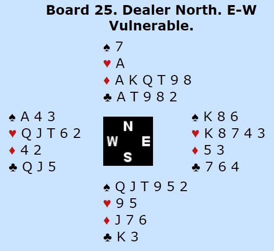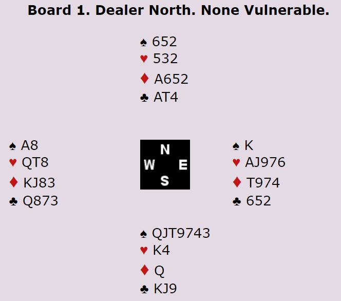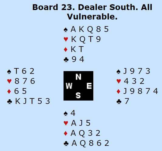 Dette er vel egentlig litt tynt for slem, men med veldig snill sits, 3-2 både i ruter og spar, kan det noen ganger bli tretten stikk i sparkontrakt. I meldingene fikk imidlertid Ø/V vite at det sannsynligvis ikke satt så snilt. Nord passet og øst åpnet med 1 spar før syd hoppet inn med en sperremelding, flere steder 4 kløver, noen steder 5 kløver. Da er det ikke så lett å melde med styring.