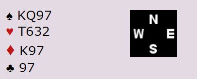 Vest tenker/håper at han kanskje har fire minorstikk og spiller ut en ruter- eller kløverhonnør og ser nords hånd komme ned som blindemann. Hvordan bør vest tenke med hensyn til fortsettelsen? (husk vest ser kun sine egne og blindemanns kort)