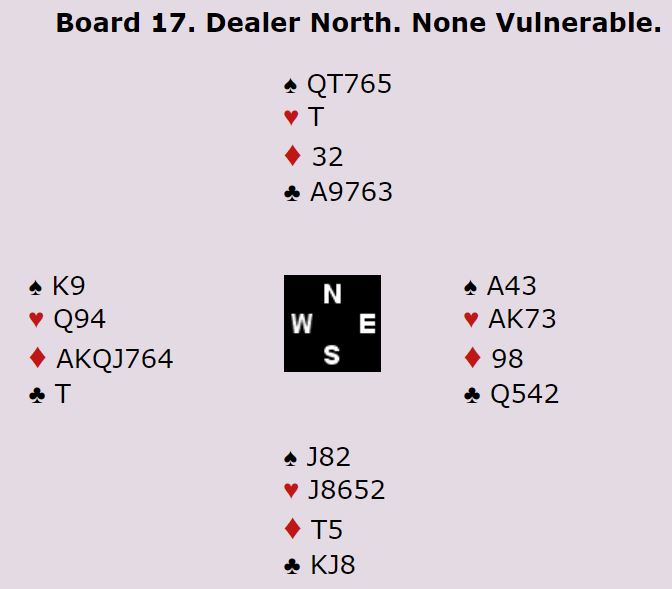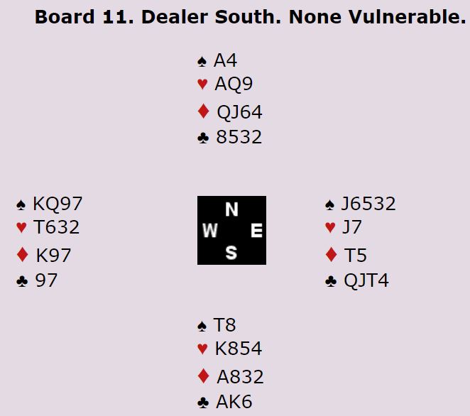 Ved det andre bordet ble uvisst av hvilken grunn vest spillefører i 5 kløver doblet. Nord spilte ut ruter knekt til esset fulgt av mer ruter. Spillefører stakk, spilte seg over på spar ess og tok trumffinessen. Trumfen ble tatt ut før to spar forsvant på ruterstikkene, og ett hjerterstikk var alt N/S fikk i tillegg til ruter ess. NZ +750 i samme kontrakt som de gikk -500 i, 15 IMP!