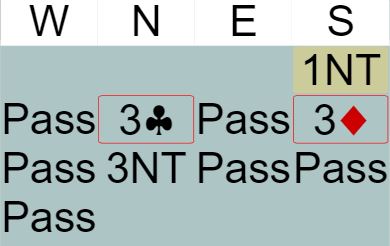 Syds har vist 15-17NT, og nord har spurt med 3 kløver, Puppet Stayman. Da viste syd en eller begge firekorts major, men ikke femkorts farge. Nord var ikke interessert i firekorts major og sa 3NT.