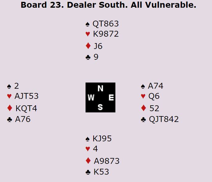 I dette spillet ble det sving mange steder, tosifret sving der utgangen 4 hjerter ble dyttet på og gikk bet ved det andre bordet.