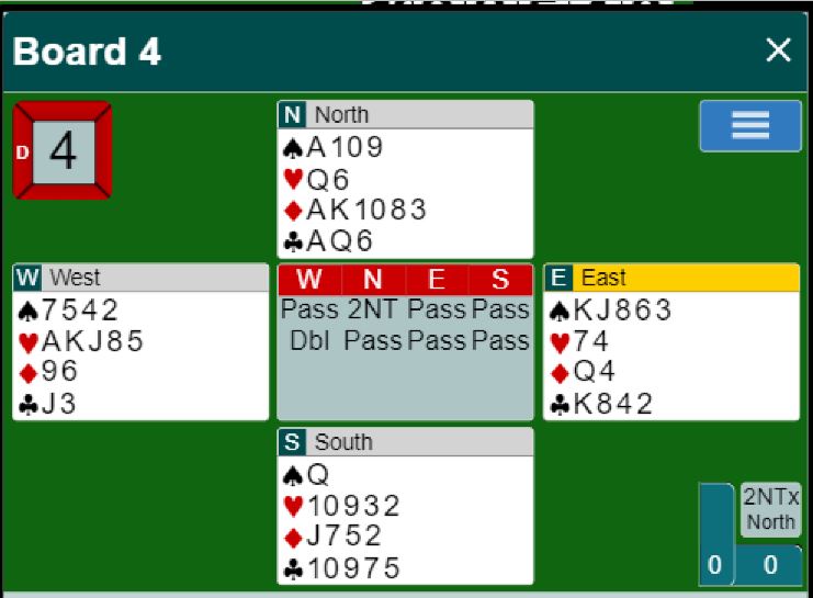 Ved det andre bordet spilte Sveits 2NT og vant den med ett overstikk etter et normalt sparutspill, +150. Mens Brogeland (vest) passet etter 2NT – pass – pass prøvde Brink seg med dobler, og det gikk pass rundt . Det skulle kanskje ikke sveits-nederlenderen gjort, selv om utspillet antagelig ba om hjerter ut, eller «korteste major ut», så de fant en god start på motspillet. Det gikk hjerter ut til vests konge, spar tilbake til kongen som tok med seg syds dame, hjerter til esset som felte damen og hjerter knekt. Nå kom mer spar. Hvis vest i stedet for å ta for hjerter knekt og dermed godspille syds tier spiller mer spar (eller kløver) blir det bet i 2NT doblet. Men siden ruteren ordnet seg og hjerter 10 var ett stikk ble det hjemgang for Grude i den doblede delkontrakten, Norge + 690! Spillet ga 11 IMP, og Norge ledet plutselig kampen med 17-1.