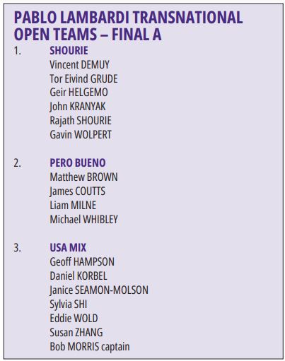 I Transnationals ble lagene plassert i grupper (12 lag i hver) etter plasseringene i kvaliken som pågikk over fire dager. Mange lag trakk se fra de to fianledagene i Transnationals siden de ikke kom til A-finale, deriblant NORWAY. Men Helgemo og Grude på lag SHOURIE er fortsatt med og spiller A-finalen i den turneringen. Etter første dag ligger de på 2.plass i underkant av 6 VP bak lederlaget. Det blir en spennende fight om gull i morgen hvor det skal spilles fem kamper (8 spill i hver kamp).