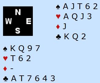 Fortsettlesen var dobler fra nord, pass fra øst og 2 hjerter fra syd. Nå er det nok ikke snakk om å melde noe mindre enn 5 kløver, eller kanskje 4 grand som betyr begge minor med flere ruter enn kløver. Med like lange farger hoppes normalt til 5 kløver andre gangen hvis man har en slik crazy håndtype (for eksempel med 6-6 i minor). Nord meldte 5 hjerter og makker som nå hadde forstått at vest ikke har bare en vanlig hånd, var med til 6 ruter. Det gikk pass og pass før nord meldte 6 hjerter. To nye passer før vest doblet uten på noe vis være sikker på at det er to kløverstikk å hente. Men det var det heldigvis: