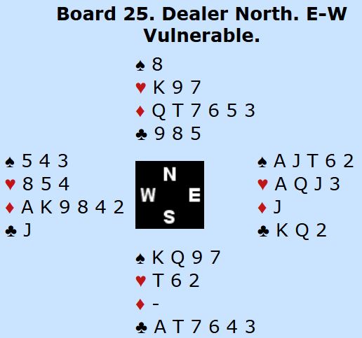 Det er jo ingen god storeslem, men en fin lilleslem. Det var noen som var i 7 ruter, og noen få vant den etter uheldig hjerterutspill. Resten spilet 6NT eller 6 ruter, bortsett fra ved ett bord...