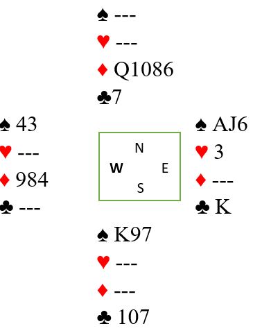 Men 4 hjerter var fortsatt ikke hjemme, det ser jo ut som syd vil få to sparstikk pluss de to stikkene de allerede har fått - en bet. Det oppstod imidlertid en lekker sluttposisjon da spillefører etter at trumfen var tatt ut tok for kløver dame, så tok han for A-K i ruter. Dette var igjen: