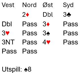 De er N/S som har høyeste kontrakt, 4 hjerter. Endel par kom seg faktisk dit. Min 2 kløveråpning slapp syd lettere innpå enn om åpningen hadde vært 2NT. Og han sa 2 hjerter, men nord var ikke med. Makker (vest) doblet som for oss viser 0-5 poeng. Da kunne nord ha sagt 3 hjerter og vi ville vært i fare for å spille mot 4 hjerter, kanskje doblet (?). Men nord passet, og 2NT fra øst ble løftet til 3NT av vest.