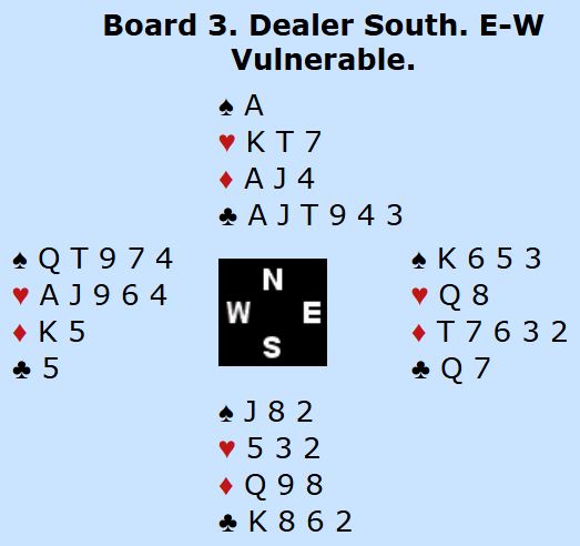 Her må vest få meldt fargene sine og gjerne på veldig høyt meldetrinn i andre melderunde. Man bør åpne med 1 ruter som min makker gjorde. Det går garantert ikke pass rundt når fordelingen ser slik ut. Så blir det å melde kløver neste gang, uansett hvor høyt meldingene har kommer. Og gjerne med et voldsomt hopp!