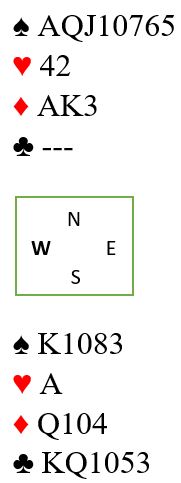 Når jeg hevdet 6NT kanskje er vel så bra som 6 spar er det en sannhet med visse modifikasjoner. For i 6 spar er det en ekstra sjanse, N/S må få med seg for ruter ess, for hvis ikke de gjør det forsvinner østs ruter på hjerter.