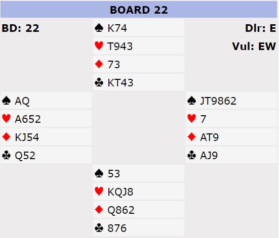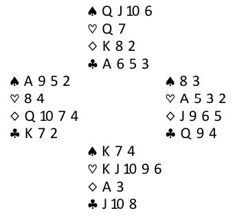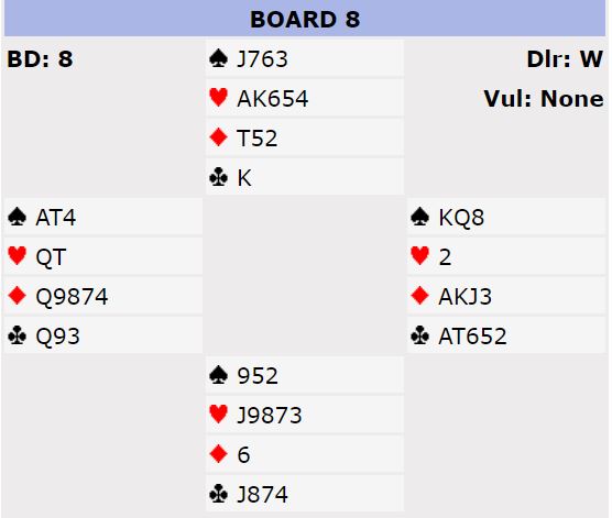 Damen tredje i kløver var ikke så dumt hos den som hadde vist begge major. Så 6NT viste seg å være en helt glimrende kontrakt. Merk at med denne kløverfargen er det 100% sikkert seks kløverstikk da esset eller kongen fra hånden avslører en eventuell 4-0 sits. Og sitter kløveren 4-0 kan senere en finesse tas over den med knekten fjerde. Så det er 2+4+0+6 = 12 stikk.