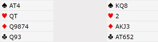 Spillet er fra lagturneringen AUTUMN NATIONALS i Australia i forrige uke hvor midt lag hang bra med midtveis i turneringen. Så kom nedturen, og den startet kanskje med dette spillet. Dette er ikke tatt med i bloggen for å fortelle at vi hadde uflaks i denne turneringen, for en gjennomgang av spillen viste meg tydeling at det med flaks og uflaks jevnet seg ut. Det ble imidlertid etter hvert en kollaps for vårt lag. Makker og jeg var ordinære. Lagkameratene var kanskje verre, skuffende siden de normalt er et at Austalias beste par. I dette spillet var de imidlertid gode. Her er østs kort: