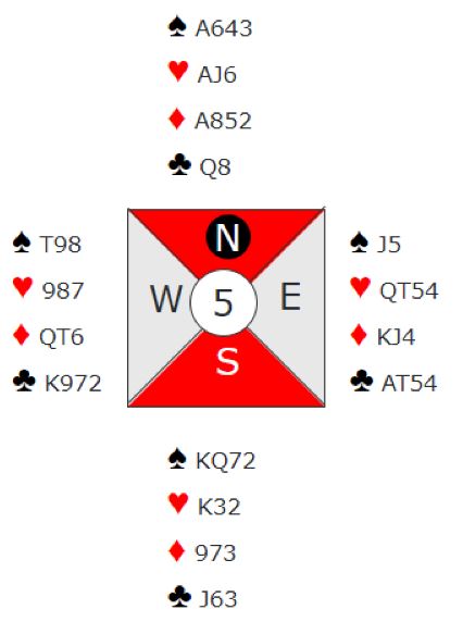 Da makker Ida Wennevold var med på notene over sleminvitten ble det så Ingunn spurte om nøkkelkort. Øst viste fire, altså de tre andre essene og trumf konge. Da vest vest at en ruter kan kastes på spar ess. Ingunn gikk nå på med 5NT som spør om konge(r) og antyder at storeslem er mulig. Da øst viste kløver konge visste vest om tolv sikre stikk. Hvis øst også har spar dame eller kløver dame står det tretten stikk, eller øst kan ha noe i kløver eller spar som kan godspilles med å stjele et kort i fargen. Ingunn satset: 7 hjerter!