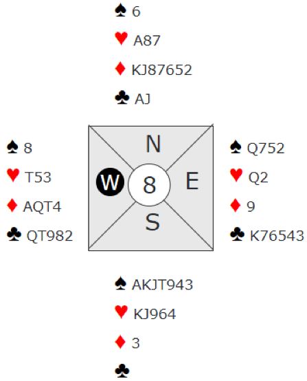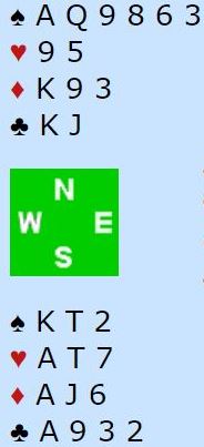 I 6 spar er det sårbart med hjerter ut. En må velge hvilken finesse som går. Hvis kløver dame sitter hos vest vinnes tolv stikk ved å ta kløverfinesse og kaste en hjerter på det tredje kløverstikket. Det er vinnende variant om ruterfinessen ikke går. Men hvis ruterfinessen går og øst har kløver dame blir det feil spilt å kutte kløveren. Det er jo ingen kløvertaper om finessen ikke prøves (og øst har damen) og kun en hjertertaper hvis øst har ruter dame.