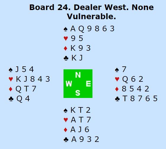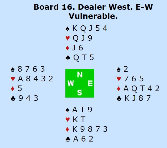 Grandåpneren (nord) hadde minimum. De som presset på til utgang gikk bet. Resultatene i feltet var omtrent delt på midten, og litt flere spilte utgang med bet enn dem som spilte delkontrakt hvor det ble åtte eller ni stikk. Ett par fikk topp N/S for +170, 3 spar med ti stikk som må ha skjedd ved at Ø/V kludret det til i kløver og fikk kun ett stikk i den fargen. For det er jo to opplagte rutertaper, to kløvertapere og en mulig hjertertaper. Men øst må jo finne et utspill, og da er det ikke unaturlig å velge hjerterutspill fra Q-10 fjerde. Da blir det enkelt ni stikk. Uten hjerter ut vil spillefører også kunne få ni stikk ved å sette opp den fjerde ruteren som gir avkast av en hjerter hos syd.