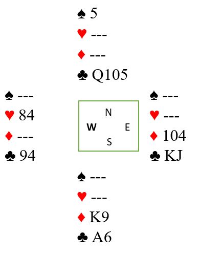 En bør i lilleslem ta med seg tre runder kløver. Kanskje sitter Q-10 dobbel eller tredje, og en kløverstjeling godspiller i så fall nieren hvis den som har både damen og tieren har kun tre kløvere. Spilles slik og det sitter slik i kløver behøves ikke ruterfinessen.