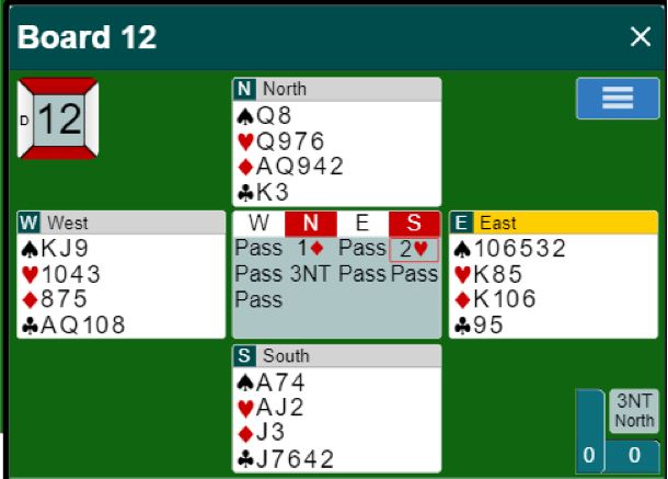 Her er et spill fra turneringen hvor en kan undre litt på hvorfor noen fikk ni stikk i 3NT, for enten burde det vel bli bet, eller flere stikk en ni?