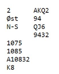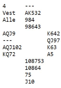 Der vest doblet og dermed viste minst trekorts hjerter, og som regel firekorts i den umeldte majorfargen ble ikke øst til å stoppe. Men nord har super hånd for sparkontrakt også. Idet Ø/V er i 4 hjerter blir det et valg for nord, melde 4 spar eller håpe det blir bet i 4 hjerter. Syd har nok håp om bet i 4 hjerter med ett ess og A-K i en annen farge. Men 4 hjerter står enkelt siden kløver konge sitter i saks. Hvordan er det med 4 spar?