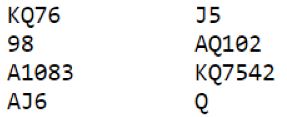 Her er et spill som for mange skapte problemer i meldingene. Vest var giver og passet, og N/S fikk melde i fred med disse kortene: