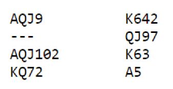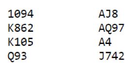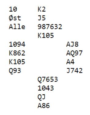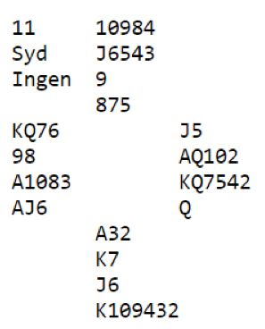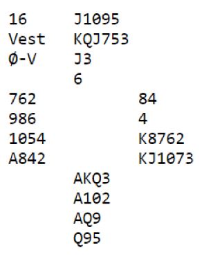 Et hverdagsspill som ville fort blitt glemt i lagkamp, Ø/V spiller 3NT hvor det bli minst ni stikk uansett hva som skjer. Så i lagkamp ville spillet blitt uavgjort, eller gitt +/- 1 eller 2 IMP til ett av lagene.