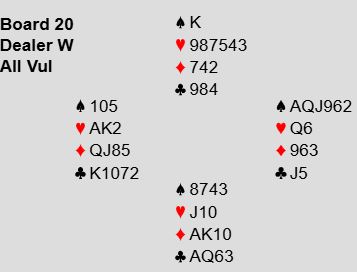 Undertegnede har på forhånd utarbeidet fire skriv med anlyser og antagelser om hva som kan i de fire MP-Treff turneringene. Og i noen tilfeller litt om hva som kanskje bør skje. De skrivene skal klubbene ha fått for å distribuere til spillerene så kan de se litt nøyere på i alle fall de mest interessante spillene ved deres bord. Det som antas/foreslås stemmer ikke alltid med virkeligheten, for uventede ting vil alltid forekomme i så store felt. I forhåndsskrivet som dekker spillene på mandag kom jeg med en påstand om spill 20:
