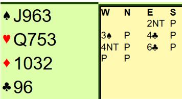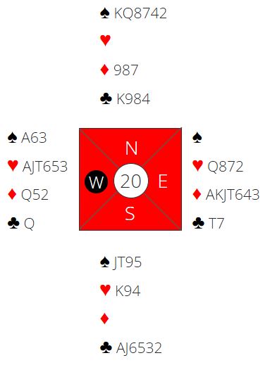Å spille 4 hjerter som Ø/V virker normalt. Det går an å vinne tolv stikk. Men da må spillefører ta ut trumfen i fire runder og deretter løse både sparen og ruteren uten taper. Kanskje får man spar ut sånn at den fargen er løst. Men det er fortsatt litt ekkelt, for spillefører har igjen kun en trumf etter uttrumfingen. Så det går an å miste litt kontroll på det hele, for det er sårbart om øst blir kortet i trumf. Det er nok lettere å spille 4 hjerter om syd har vært innpå med et svakt innhopp i spar.