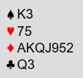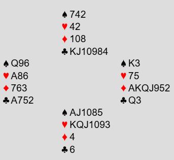 //Et skikkelig fordelingsuhyre. I slike spill er det fort gjort å tråkke feil! Det blir å spørre seg selv: skal det meldes enda en gang til, eller skal man la motparten spille sin kontrakt? Hvem har egentlig høyeste kontrakt?//