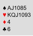//Det blir neppe mange som får tolv stikk i 4 hjerter. De få parene som eventuelt får det deler nok toppen Ø/V. Det er en grei score å notere +450, for noen får antagelig bare 10 stikk.//