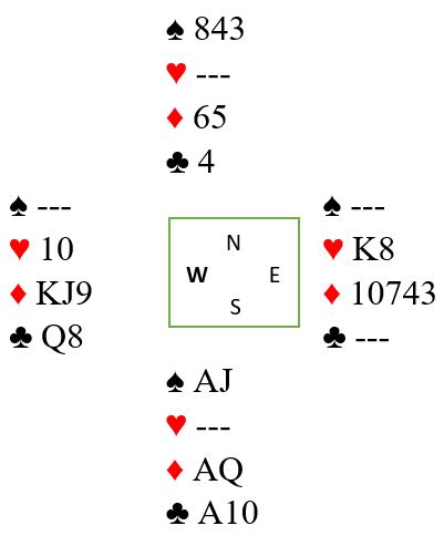 Samme hva syd velger som sin åpningsmelding kommer vest med og melder ruterfargen. Noen meldte ruter lavest mulig, andre hoppet. Hvis det hoppes i ruter er det ikke opplagt å melde med nords kort. Hun har kun 3 HP, men en syvkorts farge. Noen meldte, andre passet. Så blir det østs tur, og der må det meldes. Men om vest hoppet i ruter og det var definert som sperremelding vil ikke øst bli så optimistisk. Det blir uansett fort slik at han melder spar, og da støtter nok vest slik at de havner i utgangen 4 spar.