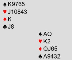 Det er dog et problem med dette. Hvis spillefører er for ivrig med å spille ruter tidlig - det ser jo fristende ut etter den starten - kan vest stikke seg inn i spar og godspille ruteren sin med kongen og en til. Da er det kun 0+4+3+1 = 8 stikk. Det bør dog bli ni stikk til slutt siden vest ikke kommer seg unna. Han må kaste en spar på fjerde runde hjerter og kommer så inn i spar (A-K dobbel) bare for å måtte gi spillefører to kløverstikk.