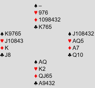 Syd skal spille 6 spar uten at motparten har meldt. I meldingsforløpet sniffet N/S litt på storeslem, men de holdt seg klokelig unna det, for som du ser er det egentlig to mulige tapere, en i hver minorfarge.