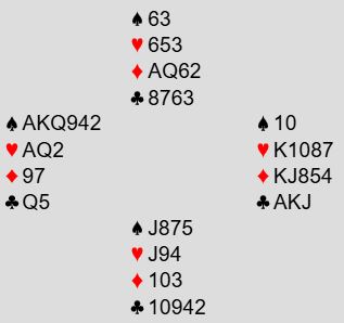 Det ser ut som det bør gå greit å vinne ni stikk om en ikke bommer veldig mye, men her er det altså en kan få fatt i mange ekstra poeng om det blir maks med stikk. Hvordan spille kontrakten er dog ikke så opplagt. Slik så hele spillet ut: