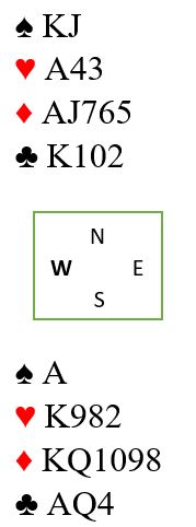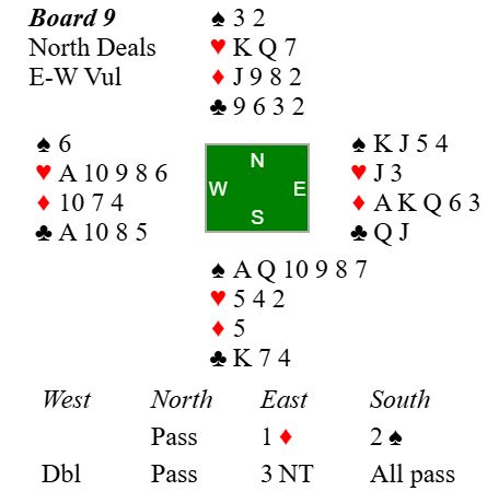 Jan åpnet med 1 ruter og hørte 2 spar fra syd, definert som svakt innhopp som jammen inneholdt ganske bra kort denne gangen. Vest doblet (hjerter), og etter pass fra nord meldte Jan (øst) 3NT. Spar 10 kom i utspill fra syd. Øst vant stikket med spar knekt. Siden syd trolig satt med sekskorts spar var det ingen umiddelbar fare selv med spar gjennom fra nord en gang. Ruterfargen kunne gi fem stikk, men det gjør den i så fall senere og, tenkte Jan. Kløver knekt ble spilt, liten-liten-liten (syd burde ha dekket). Så kom hjerter knekt som fikk løpe til honnør hos nord. Derfra kom spar til syds nier. Syd ville ikke sette opp spar konge (i så fall det niende stikket) og spilte kløver konge bl.a. for å ta bort inntaket til vests hjerterfarge. Kløver konge tok med seg esset og østs dame. Så ga kløver 10 (nord hadde stopper med nieren fjerdE) før hun gikk i gang med ruteren fra topp. Sitsen i den fargen ble oppdaget i andre ruterrunde, og dette var igjen: