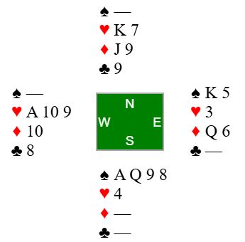 Uforståelig nok, vest spilte ut ruter 7 (norsk fordeling) ved det bordet også. Det gikk ruter 9, 10 og konge fulgt av spar ess og mer spar til vests konge. Det kom nok en ruter (!) til esset. Rutersitsen var nå på det nærmeste klar uten at det hjelper noe, det ser uansett ut til å være fire uungåelige tapere. Vest må ha rutersyveren dobbel, for om han hadde startet med fire ruter ville utspillskortet - syveren - vært det nest høyeste kortet. Inne på ruter ess ble kløver 10 spilt til vests ess. Han spilte mer kløver til østs konge. Ingen ting som koster noe har egentlig skjedd så langt, og de vil fortsatt få ett hjerterstikk mot slutten - betestikket - ikke sant?