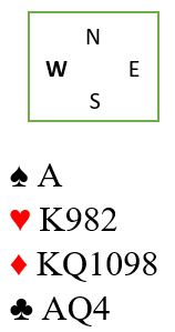Makker har hjerter ess, ruter ess femte eller sjette og kløver konge. Det er kun 11 poeng. Det er sannsynlig at grandåpneren som må ha minst fire HP til har noe fint i hjerter i tillegg til esset, men det plass til de poengene i kløver/spar. Men hva med fordelingen? Hvis makker har dobbelton hjerter er det en helenkel stoerslem i ruter. Og har han trekorts hjerter og dobbelton kløver er det også en sikker 7 ruter da kløver dame i så fall gir avkast for en hjerter fra makkers trekortsfarge. Det enrste som kan gå galt om du melder 7 ruter er at makker har spesifikt to spar, trekorts hjerter uten damen, femkorts ruter og trekorts kløver. Skulle han ha den eneste fordelingen som ikke er bra kan han jo hjerter A-Q-x - da er 7 ruter nedelgg - eller A-J-x slik at det i alle fall er en sjanse. Og har makker sekskorts ruter må han ha enten dobbelton hjerter eller dobbelton kløver, og da er 7 ruter bombesikker.