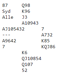 Samtlige Ø/V-par noterte utgang. En rekke par fikk 660 som ga -6,2, og endel fikk 690 som ga +13,5. Det er egentlig litt vanskelig å se for seg hvordan det blir elleve stikk, og ikke helt opplagt hvordan det blir tolv heller. For om man lukker igjen øynene og tar begge de sorte finessen blir det fem stikk i hver av de fargene pluss tre stikk i rødfargene, tretten totalt.