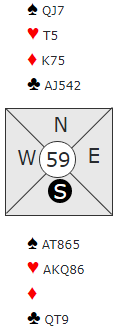 Men det er altså parturnering. Noen tenkte nok på det og klinket til med 3NT. Etter min mening er det en alt for stor sats å ta. 3NT kan være helt elendig og mye dårligere enn 4 hjerter om makker er svak i spar. Selv om han har noe sånt som AKx i spar er de fort ett ekstra stikk i hjerterkontrakt sammenlignet med grandkontrakt om de har 4-4 tilpasning (en spar kan trumfes, ekstra stikk).