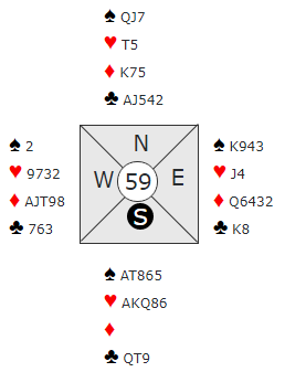 Hvis esset hadde kommet på fra syd ville det vært enkelt, østs fjerde kløver ville gitt avkast for en av vest sine spar. Så syd som hadde kløver ess måtte legge liten to ganger, hvis ikke vinnes 6 ruter enkelt.