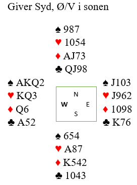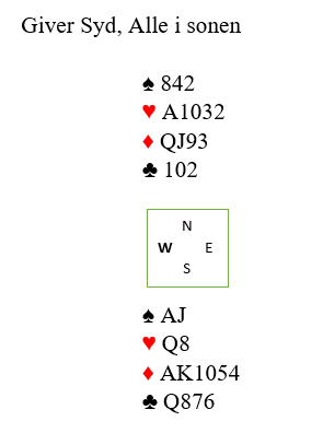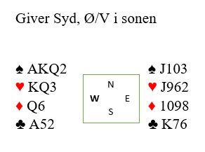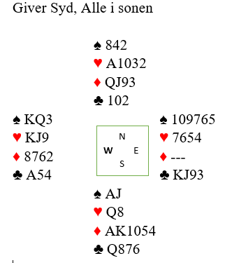 Her var kontrakten 3 hjerter ved begge bord. Norges spillefører gikk en bet etter å ha toppet hjerteren og ett stikk i hver majorfarge, to ruterstikk og ett i kløver.