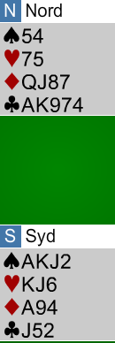 Vi som ser alle kortene har ingen problemer, vi tar ruterfinesse riktig vei og vinner utgangen. Men dansken som kun så sine egne kort og blindemanns tok sparfinessen og gikk bet. Hvilken finesse som lykkes er vel hipp som happ, så spillefører kan kansjke ikke klandres?
