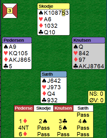 Det står i både 6 spar og 6 grand N/S, +1440 for grandkontakt, men det er vel ganske naturlig at man heller spiller sparkontrakt siden ruter"stopperen" er mildt sagt dårlig. Par-score (teoretisk maks resultat med maks innsats fra begge sider) er 7 kløver doblet av Ø/V, -1400.