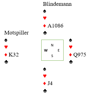 Nå ville beste motspill vært mer hjerter, men syd kunne ikke vite det (øst kunne hatt åtteren). Kanskje var sparutspillet mye bedre enn det var her, tenkte nok han, og han fortsatte med spar 8. Spillefører hadde da fire sparstikk, og det så lyst ut, her kunne det bli veldig mange stikk! Men han visste fortsatt ikke hvilken minorfarge syd satt med.