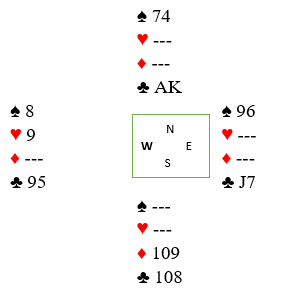 Våge vant nok et kløverstikk og det ville vært tretten enkle om både spar og ruter hadde gitt full uttelling. Som du ser sitter sparfargen 4-2, så det er fortsatt "kun" tolv stikk. Et lite forsvar for østs feil i det andre kløverstikket er at det kan han se ikke er tilfelle, sparfargen sitter ikke rundt. Men Våge hadde fått den hjelpen han trengte. Fortsettelsen ble halvmeteren med ruter, og før den siste så det slik ut: