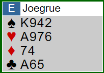 Noen åpner med slikt, men Grue passet. Helness (syd) åpnet med svake 2 hjerter. Moss (vest) doblet opplysende, og nord sa pass. Hva ville du meldt nå?