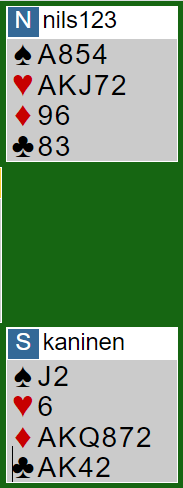 Jeg fikk beholde for spar konge og fortsatte med spar, og det er nok feil motspill siden jeg kan se at nord sin kløver trolig vil gi ruteravkast.